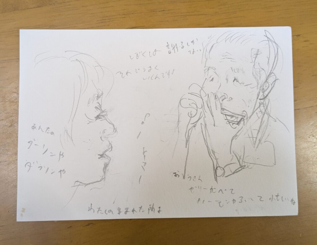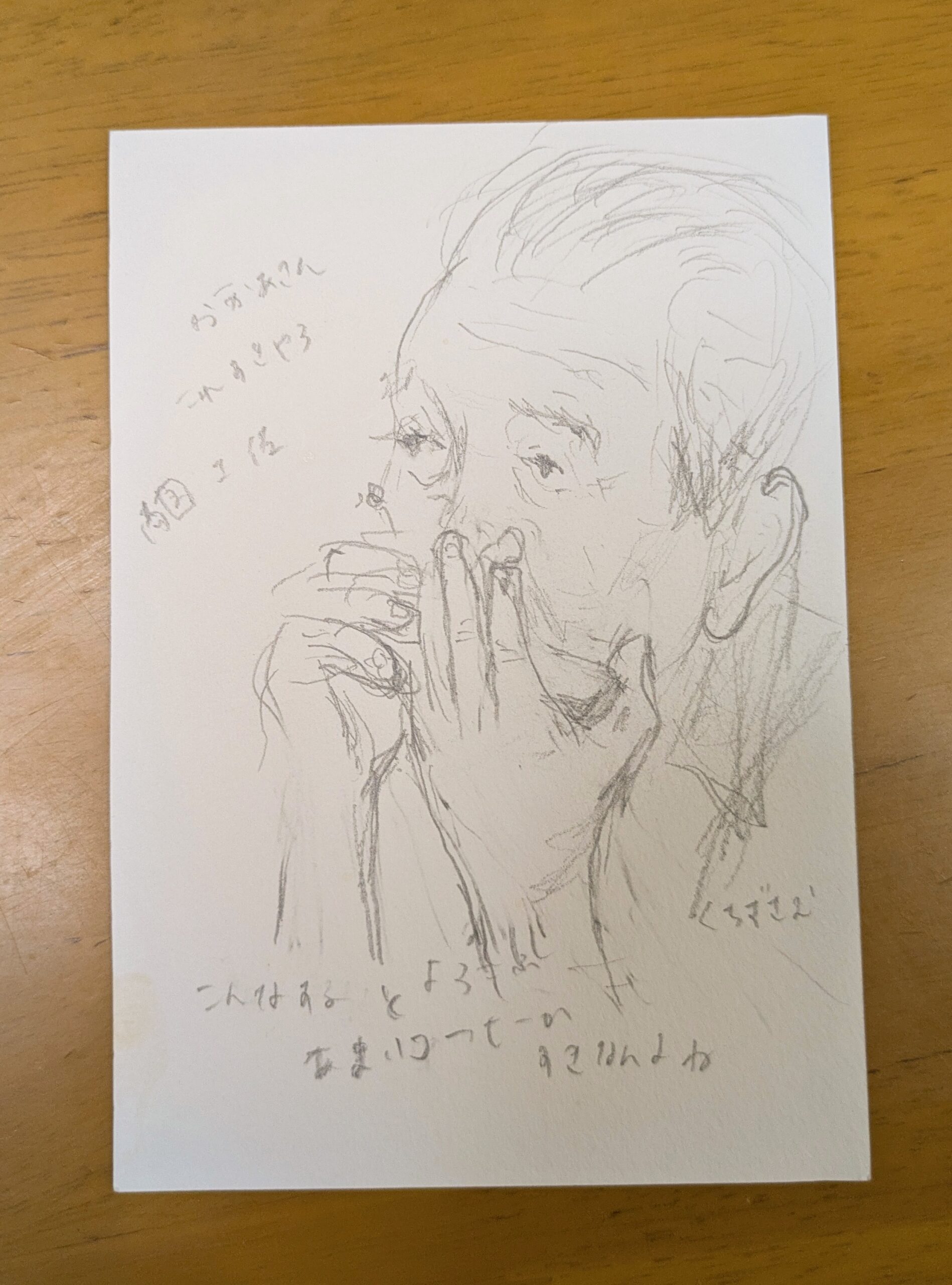 今月も無事開催 Uncategorized X Facebook LINE コピー 2025.07.27 今日はけんカフェ開催日 暑いので心配していましたが みなさん来てくださいました。 おしゃべりは盛り上がり オセロ対決したり 裕次郎の歌を歌ったり 楽しく過ごされていました。 母が来月からお世話になる施設の方も見学に来てくださり有り難い限りです。 きっと楽しくデイサービスに通うことでしょう。 今日は似顔絵を描いてくれるスタッフが来てくれたので、たくさん描いてくれました。 ピアノ弾いてくれるスタッフ いつも参加してくださる仲良しご夫婦 父と母 ハーモニカに夢中な父 私はこのタッチの絵が大好きです。