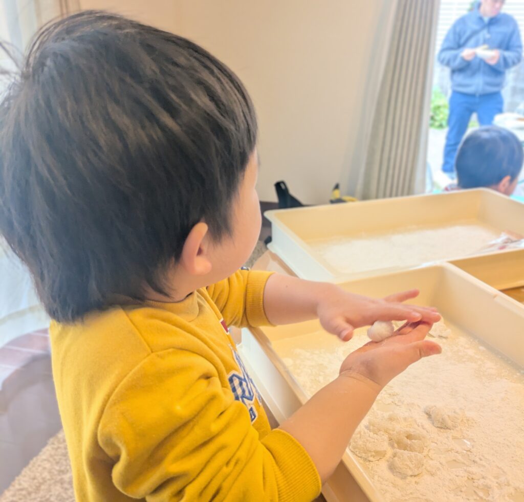 お友達と一緒に餅つき体験をし