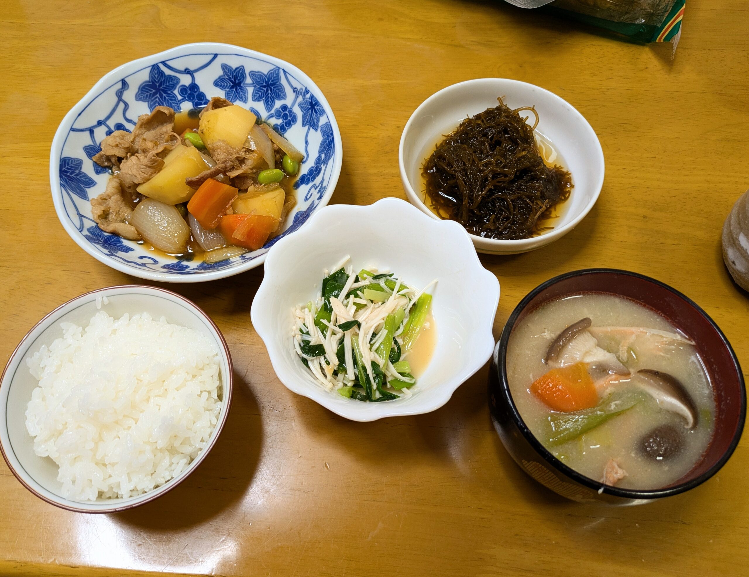 肉じゃがのじゃがいもは見切り品で安く仕入れたし、味噌汁は鮭のあら炊き。あとはもずく。